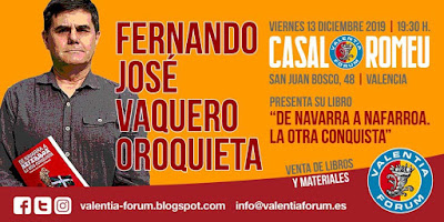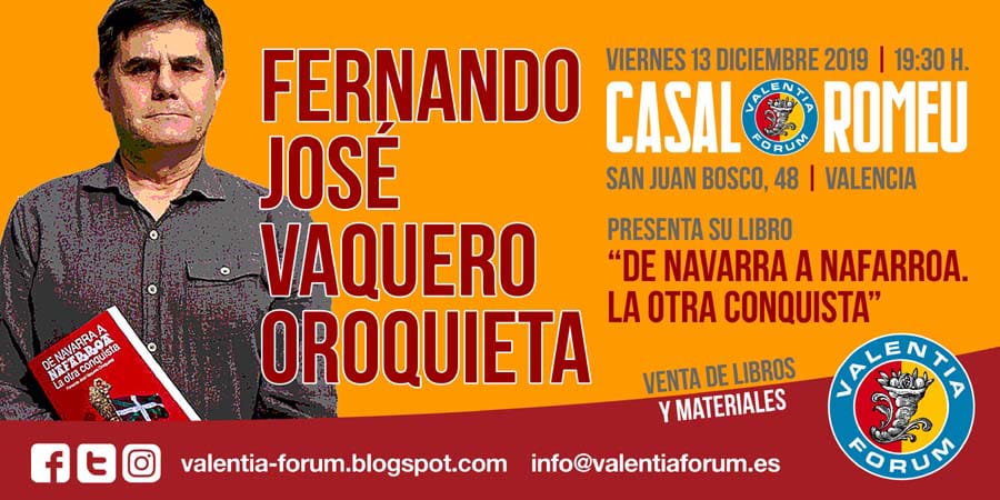 El pasado viernes 13 de diciembre Valentia Forum organizó una nueva jornada cultural en el Casal Romeu de Valencia. La presentación del libro de Fernando José Vaquero Oroquieta “De Navarra a Nafarroa. La otra conquista”.
