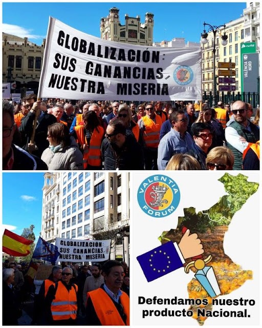 Representación notable de Valentia Forum en la manifestación por los cítricos valencianos convocada por la «Palataforma por la dignitat del llaurador», con una llamativa pancarta contra la globalización, como colofón a nuestra campaña por la gastronomía autóctona y el producto nacional.